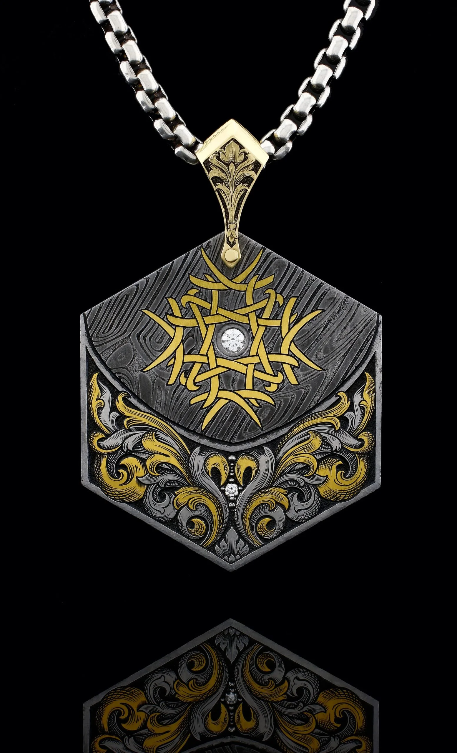 Adam’s design and his intricate, precise engraving make his jewelry stunning examples of his artistry and craftsmanship. His mixed-metal work is exceptional, and we’re honored to show it in our shop.